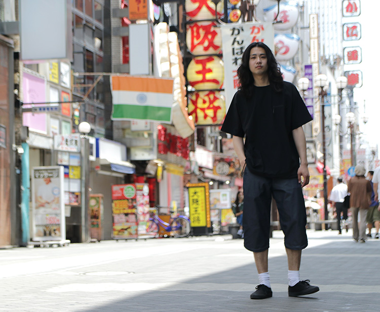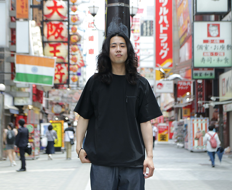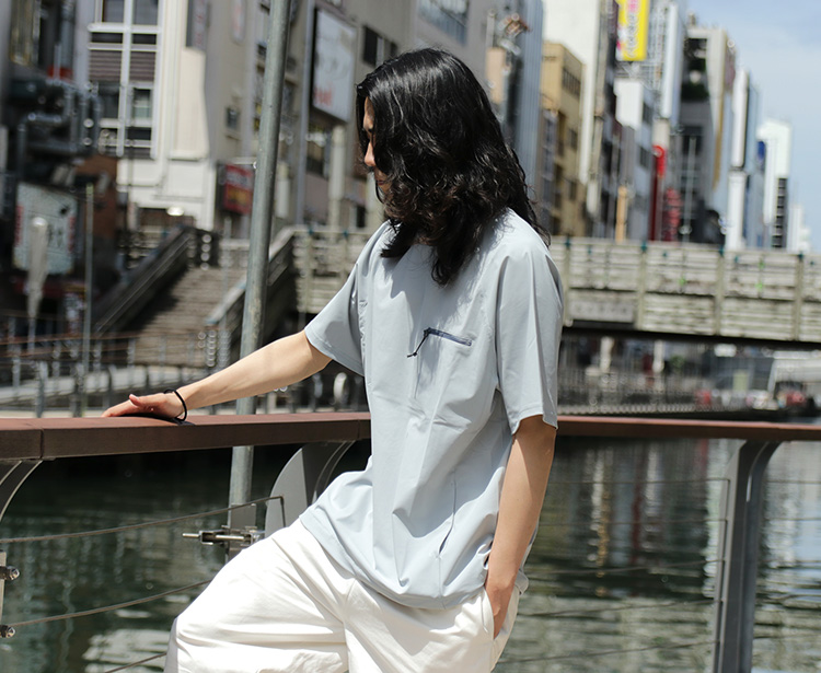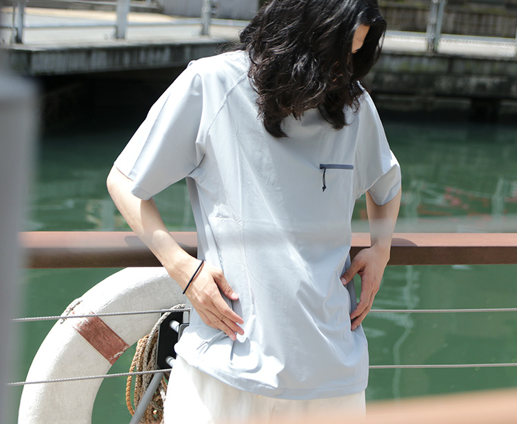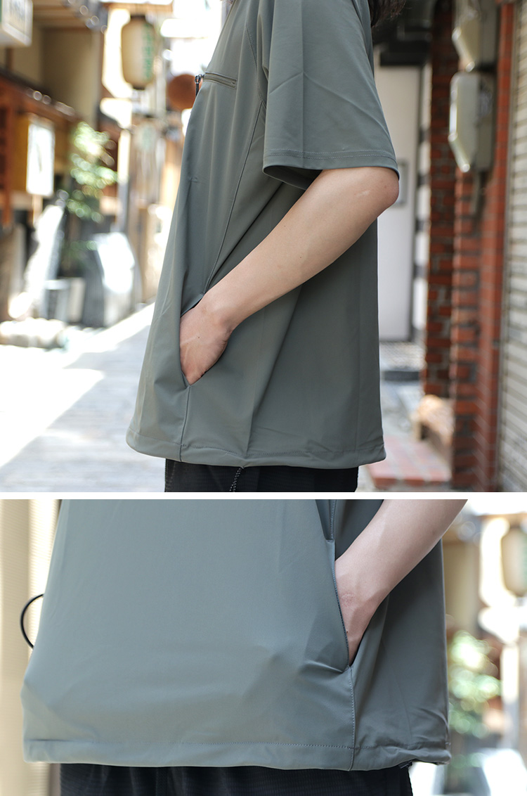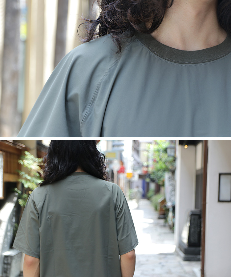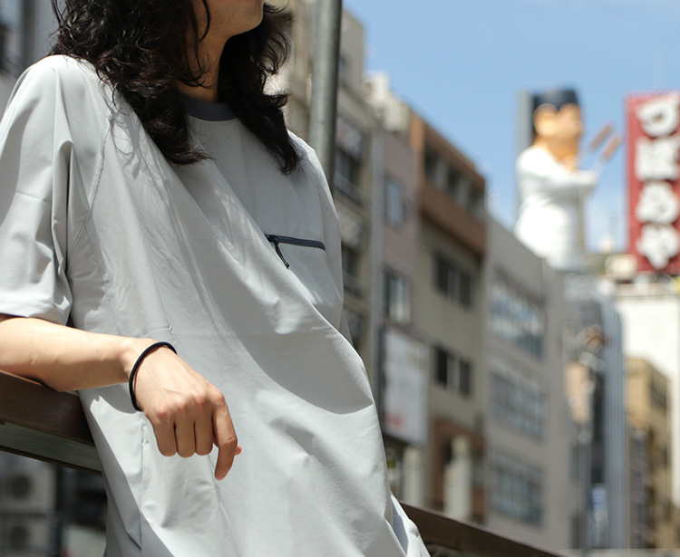 ぎゅっと絞ればただのTシャツでは出せないシルエットの変化がこの紐ひとつで実現する。