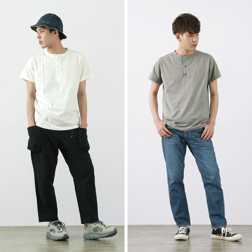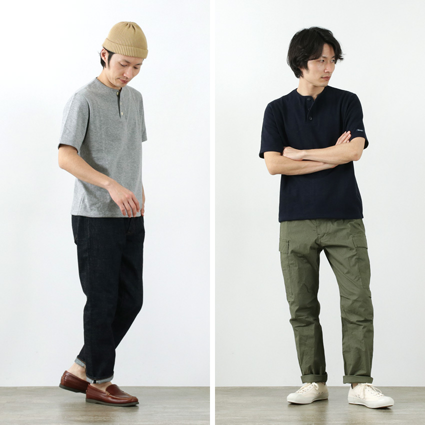 定番人気の9ozヘビー生地を、レトロな雰囲気を感じるヘンリーネックTeeに落とし込みました。前立ては、同色で写真では分かりにくいですが、別布に切り替えるこだわり。そして、細ネック。ちょっとした事ですが、見え感が全然違うんです。